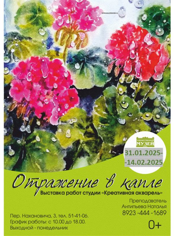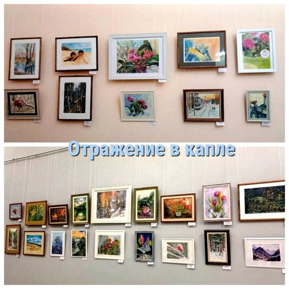 Выставка студии «Креативная акварель» представляет работы обучающихся углубленной группы освоения акварели. Это плановая выставка в рамках деятельности изостудии Томского областного художественного музея. Её название – «Отражение в капле» – стремится отразить многообразие проявления воды в природе. Изначально мы планировали сделать небольшую выставку на одну стену в фойе музея по изучаемой теме – капли, вода стоячая и водопады. Но потом нам был предложен еще и зал лектория. Поэтому к написанным каплям и водопадам мы добавили работы, написанные и в 2023 году и не выставляемые на этой площадке ранее, в которых так или иначе проявляется связь с водой. В экспозицию вошли 32 акварельные работы по темам программы: вода и отражения в воде, отражения в стекле, капли на стекле, горные пейзажи и цветы, вода, лед, иней и снег в разных акварельных техниках (акварельный пуантилизм, способы старых мастеров, метод негативного пространства, техника отдельного мазка и др.).