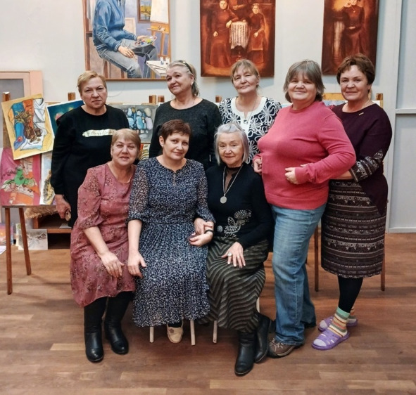 На фоне рабочей выставки в изостудии музея, 2023 г. Группа углубленного освоения акварели небольшая, сейчас в ней осталось 7 человек. У всех накоплен немалый опыт общения с акварелью. «Для акварели принципиально важна идея. Идея ведет себя так же, как акварельная краска: растекаясь по бумаге она заполняет символами каждый доступный уголок пространства. акварель отображает лишь самые важные черты и моменты, оставляя прочее на откуп фантазии. И тут не важны ни композиция, ни сюжет, ни герои, а важно то, что их объединяет. Это то, превращает высказывание автора в произведение»