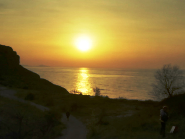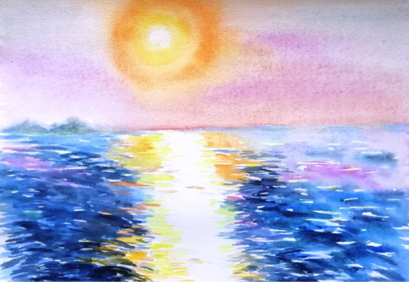 Фото 6. Акварельный скетч рассветного солнца. На горизонте в туманной дымке угадываются очертания дальних гор. Акв., 26х35