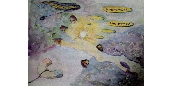 А что произошло с другой галактикой? Звёздочка бросила в неё свой груз и закричала что было силы: «НА ВЕДРО МЕДА!» Эхо разлетелось по всей галактике, но, как это бывает часто с эхом, отразилось обратно немножко исковерканным. Две буквы, В и Е из слова ВЕДРО, вообще исчезли. Первые две буквы, Н и А, перепутались местами, и получилось: