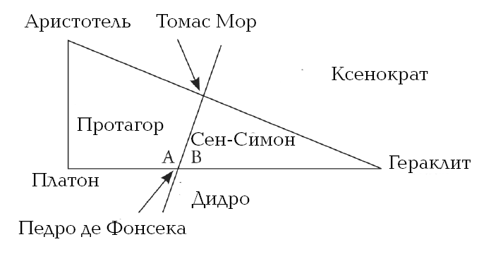 Вернувшись в свой крошечный кабинет, он обнаружил бумажку и, прежде чем выкинуть ее в мусорное ведро, застыл, рассматривая ее, на несколько минут. Рисунок 1 объяснялся просто – скукой. Рисунок 2 казался продолжением рисунка 1, но добавленные имена показались ему дичью. Нет, Ксенократ там мог находиться – в этом была своя абсурдная логика, и Протагор тоже, но… что там делали Томас Мор и Сен-Симон?! Что там делали, как могли вообще появиться там Дидро и, Боже правый, португальский иезуит Педро де Фонсека, который был одним из комментаторов Аристотеля, им счет на тысячи идет, но его же никакими акушерскими щипцами не протащишь в ряд великих мыслителей?! А вот рисунок 3, напротив, обладал своей собственной логикой – логикой придурковатого подростка, подростка, бродяжничающего по пустыне в изношенной одежде – но все же в одежде. Все эти имена, можно было сказать, принадлежали философам, которые посвятили труды онтологическому аргументу. Вот эта В, что сидела на верхнем углу треугольника, вписанного в четырехугольник, могла быть Богом или существованием Бога, которое вытекает из его сущности. Только тогда Амальфитано заметил, что на рисунке 2 также присутствуют А и В, и тут уж уверился: это все жара, он к ней не привык, и из-за нее он пишет чушь во время занятий.