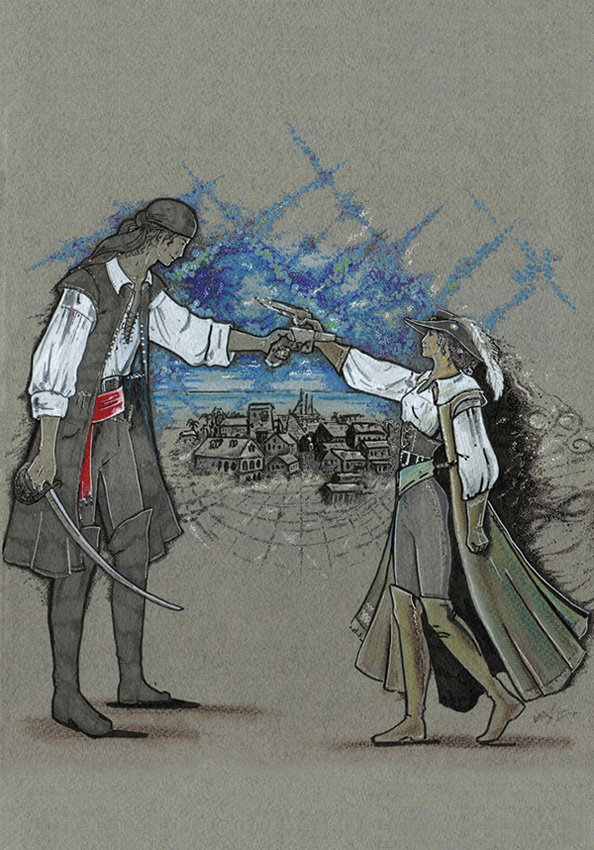 Но пиратка выхватила другой так же быстро. Два дула смотрели друг на друга, скалясь от радости, что о них вспомнили.