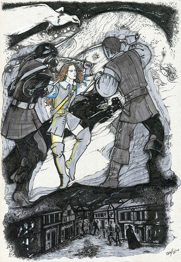 Неподалеку на улице дрались. Рыжая женщина в красивой одежде мужского кроя, отбивалась от двух нападающих. Она отменно владела оружием, но нападающие не уступали ей силой и умением. А их глаза… Их глаза были пусты и мертвы, какими становятся лишь от пережитых страданий, – боль расплавленным железом выжгла сердца этих двоих. Рыжей не победить, сумерки выпьют свет из ее насмешливых карих глаз, а золото волос истлеет.