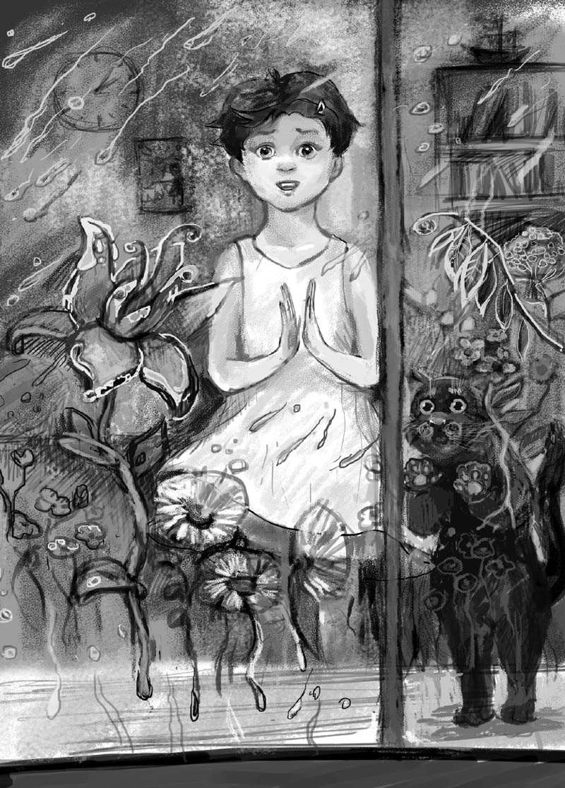 At home, she even washed the dishes and sat down to do her homework. She wanted to do everything in time, so that when the rain would come, she could hear the rest of the story in peace.