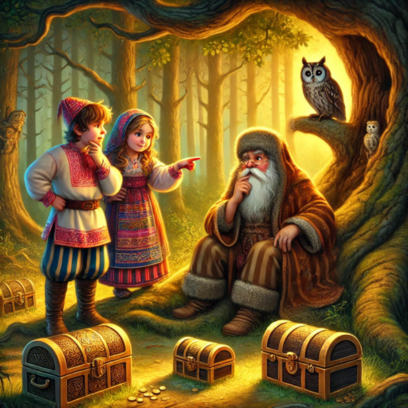 В одном далёком русском селе жили брат с сестрой, Ваня и Маша. Однажды осенним вечером они решили прогуляться в лес. Вскоре они наткнулись на старый дуб, а под ним сидел мудрый лесной дух Леший.