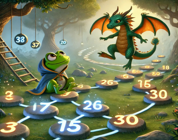 В центре этого удивительного мира жила Звёздная Лягушка по имени Фло, которая обожала математику. Она умела прыгать по числам, как по камешкам, и всегда находила правильный путь по реке.