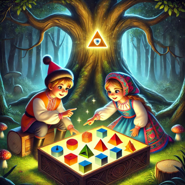 В одной деревне, окружённой густым лесом и зелёными лугами, жили брат с сестрой – Иван и Дарья. Однажды они услышали от бабушки о загадочном Лесном Короле, который спрятал сокровища в волшебных фигурах. Только тот, кто разгадает тайны геометрии, сможет найти эти сокровища.