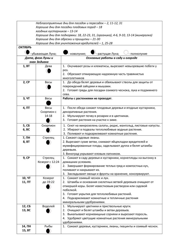 – Плоды к столу убирают дни новолуния (корнеплоды) и в дни полнолуния (все надземные).