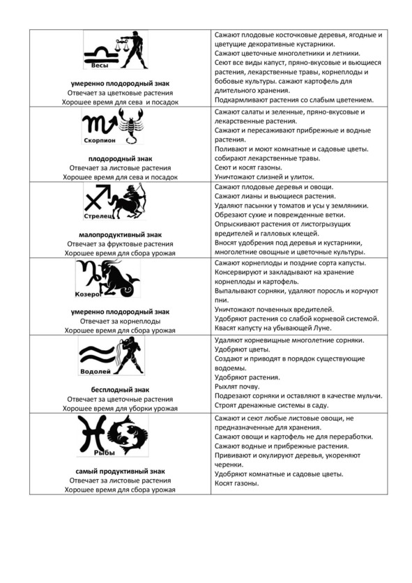 Непродуктивные знаки – Овен, Лев, Стрелец, Водолей, Близнецы, Дева. В эти дни неплохо пропалывать сорняки. Знаки Водолея и Льва считаются бесплодными, а Козерог – умеренно плодовитым.