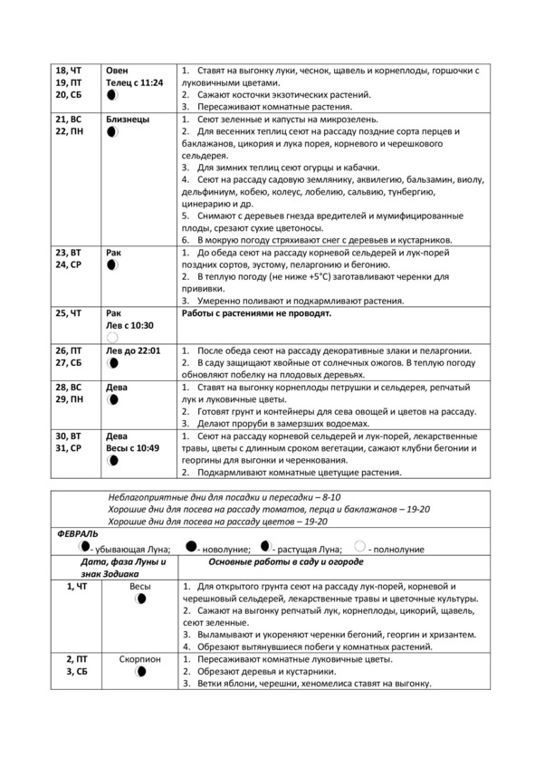 С учетом фаз Луны обрабатывать землю лучше, когда Луна проходит по знакам земли (Телец, Дева, Козерог), воды (Рак, Скорпион, Рыбы) и воздуха (Весы). Прополку сорняков и прореживание всходов проводят в знаках огня (Овен, Стрелец), воздуха (Водолей, Близнецы) и в знаке земли (Дева). Сеют, сажают и пересаживают растения, когда Луна находится в знаках Земли, Воды и в знаке Весов.