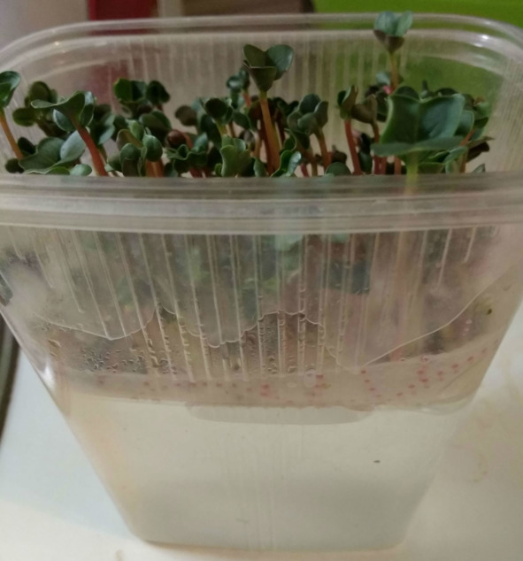Два одноразовых пластиковых контейнера – один на 500 мл, второй на 250 мл. В дне контейнера на 250 мл горячей спицей сделала множество проколов (они нужны для проникновения корней в воду). В большой контейнер наливаю воду, в маленький насыпаю семена и ставлю в большой. На первые дни накрываю крышкой, сделав в ней проколы.