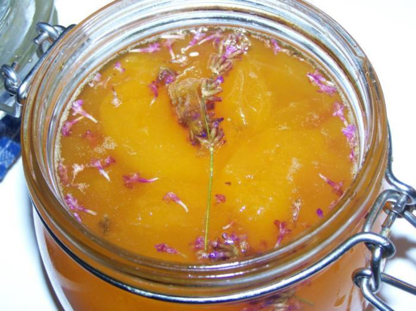 Второе по популярности абрикосовое варенье – с лавандой. Мне нравится, когда в янтарном сиропе плавают не только отдельные цветки, но и целые веточки лаванды. Аромат божественный, привкус слегка терпкий. Утром разрежешь свежую булочку, размажешь тонким слоем сливочное масло и сверху ломтики абрикоса с лавандовыми цветочками: дивный аромат, смешавшись с запахом кофе, мгновенно пробуждает ото сна.