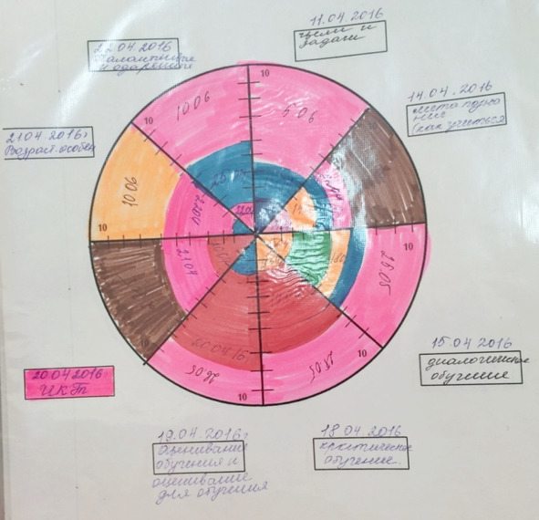 Разработка таких шкал позволила каждому учителю осуществлять свой собственный мониторинг усвоения модулей программы. Так, в начале изучения того или иного модуля учителю необходимо было согласно представленной шкале (рис. 1) отметить в листе самооценивания в виде «Колеса» свой первоначальный уровень осведомленности по данной теме и исходя из этого сформулировать ожидаемые результаты. Для того чтобы было легко отслеживать свое развитие, учителям предлагалось отмечать свой уровень продвижения в изучении модулей в начале и конце сессии разными цветами (рис. 1).