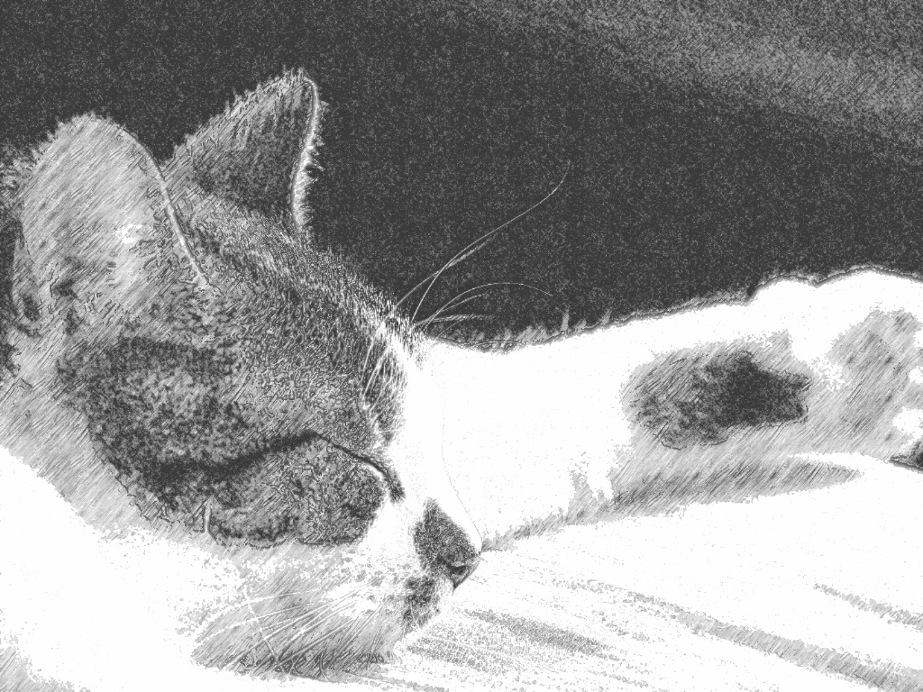 Взобравшись на стул, Кот постарался сосредоточиться полностью на обеде. Упершись передними лапами о столешницу и приняв тем самым начальственный вид, он буравил глазами содержимое тарелки. Затем простёр одну лапку вперёд, как бы изображая повелителя куриных ног и гипнотизёра посуды. Расправляя лапу и выпуская когти, а затем, подбирая их и сжимая пальцы в кошачий кулачок, «повелитель» сглотнул слюну. Какой-то звук привлёк его внимание – это фотография покачнулась на гвоздике, вбитом в стену. Лапа предательски задрожала, и Кот возопил: