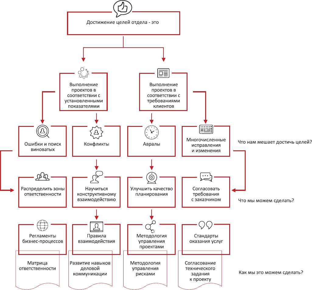 Применение несложной методологии проблемно-целевого анализа позволило наглядно обозначить, достижение каких целей и/или решение каких проблем даст возможность повысить эффективность работы отдела.