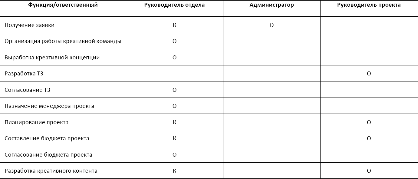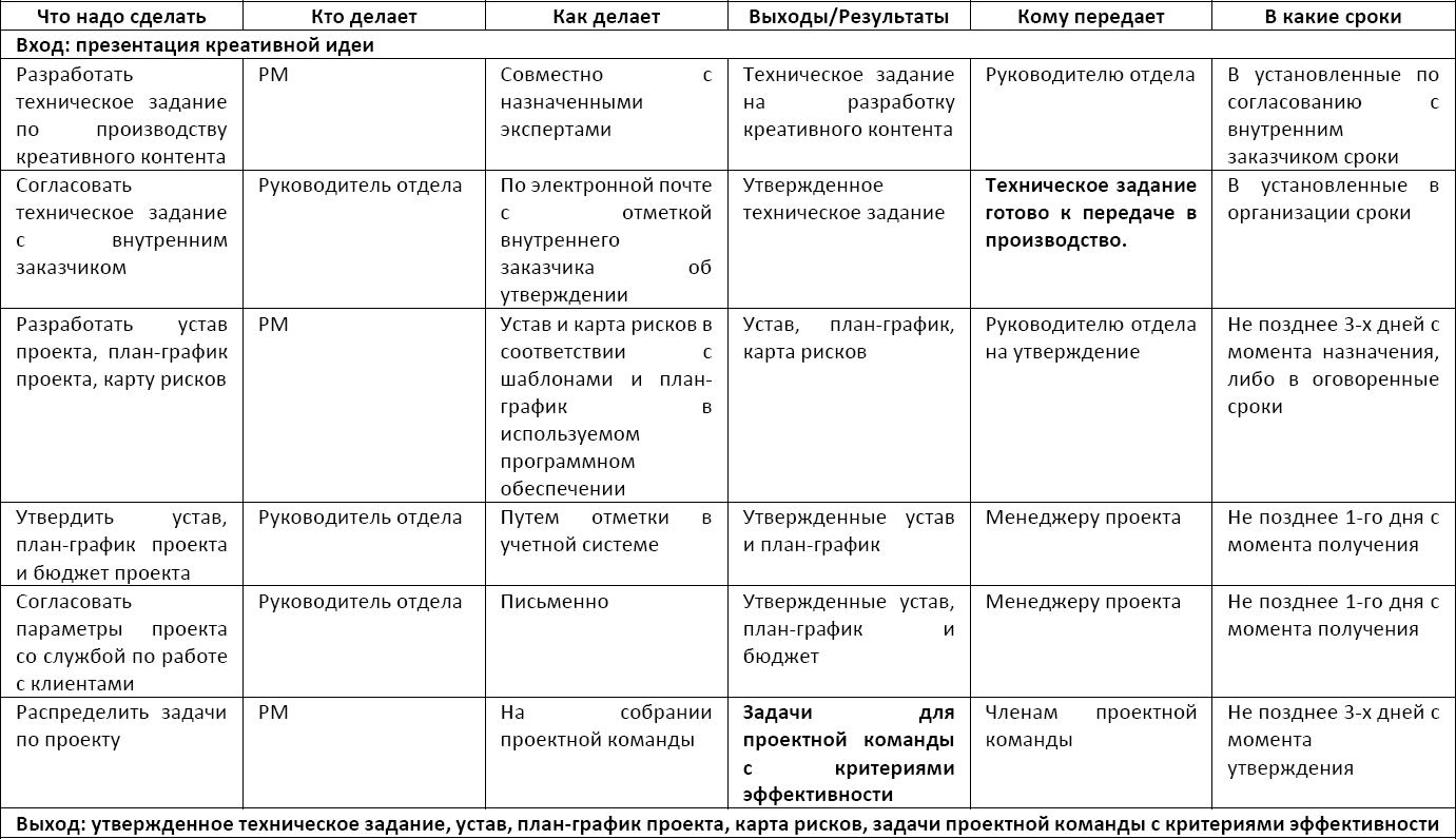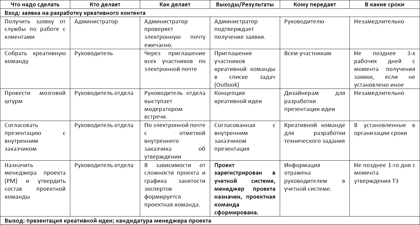 Представим бизнес-процесс по созданию креативного контента в виде таблицы (Таблица 2).