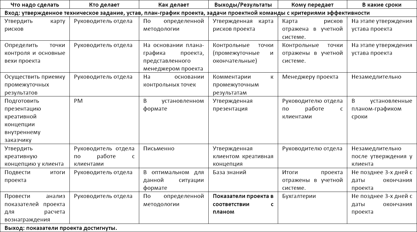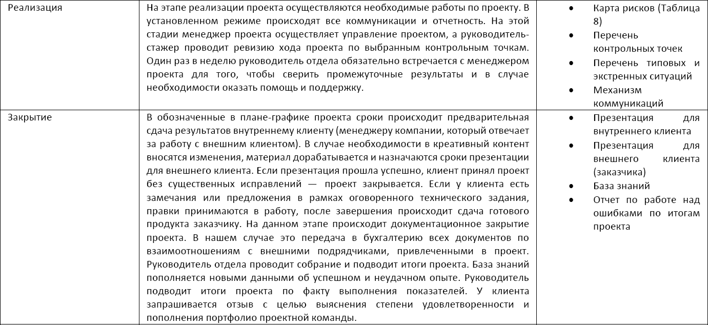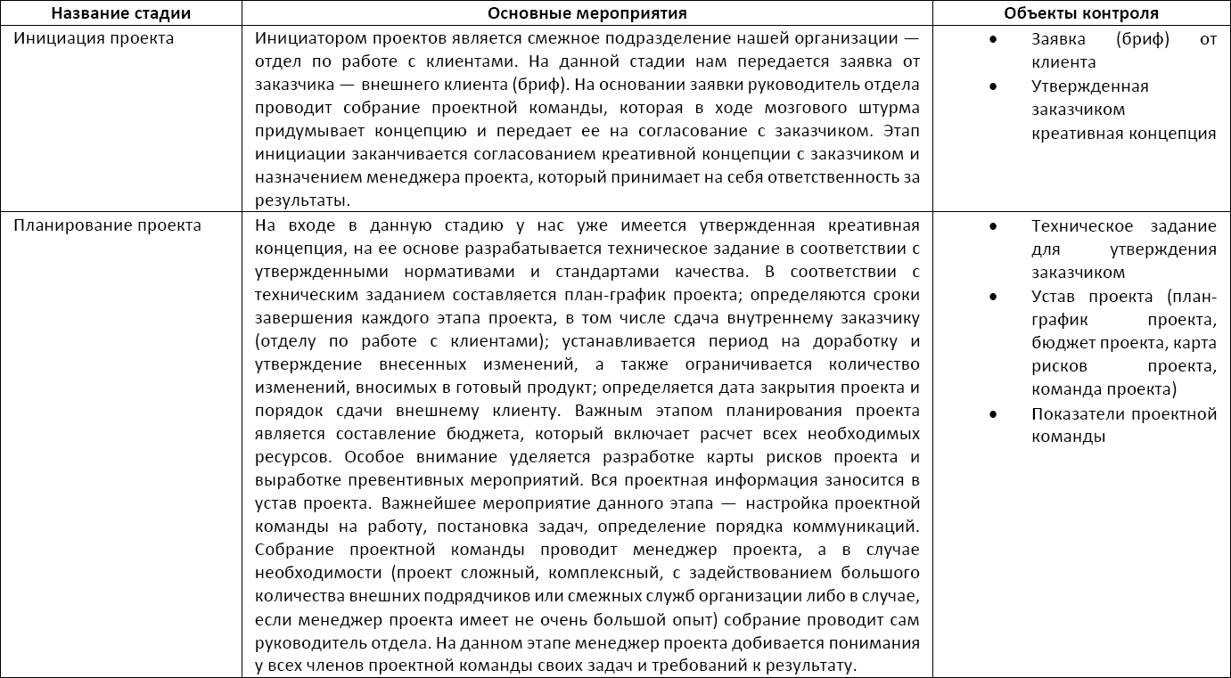 П. ДрукерТак как деятельность по созданию креативного контента носит исключительно проектный характер, то все описанные выше бизнес-процессы являются составной частью каждого реализуемого в отделе проекта. Для того чтобы управление проектами реализовывалось по единым стандартам, мы разработали и утвердили общую методологию, которая содержала в себе описание необходимых процедур на каждой стадии проекта, а также перечень необходимых документов и их шаблоны.