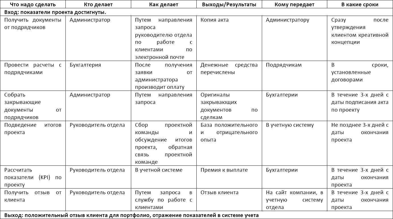 Таблица 5. Бизнес-процесс «Закрытие проекта»