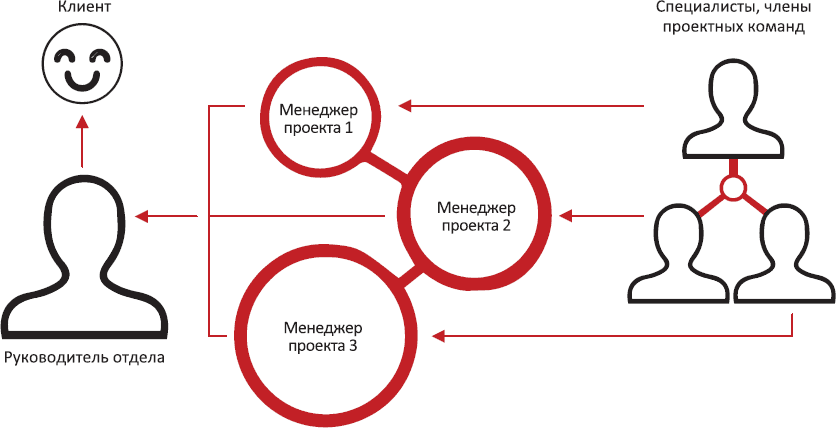 Особенность нашего отдела в том, что деятельность по производству интеллектуального продукта носит проектный характер. Соответственно, и организационная структура отдела является проектной, предполагающей двойное подчинение сотрудников – руководителю отдела и менеджеру проекта. Более того, одновременно в нашем структурном подразделении может реализовываться несколько проектов, а одни и те же сотрудники входят в состав проектных команд и подчиняются одновременно разным менеджерам проектов. Подобная структура неизбежно создает сложности в управлении, если не основывается на базовых принципах менеджмента: планировании, организации, мотивации, координации, контроле. Но, с другой стороны, в деятельности организаций, подобных нашей, проектная организационная структура позволяет экономить на фонде оплаты труда за счет рационального распределения трудовых ресурсов. Поэтому для эффективного управления отделом с подобной организационной структурой требуется четкая координация работы и слаженное взаимодействие всех участников проекта и заинтересованных сторон. Обеспечить подобное взаимодействие только административными мерами крайне сложно. И вот именно здесь и требуется идеологическая, ценностная основа, как, например, продуктный подход и клиентная ориентация, описанные выше. Добиться ориентированного на ценности компании поведения сотрудников позволяет корпоративная культура особого типа. О методах культивирования корпоративных культурных ценностей, которые позволяют организации достигать поставленных перед собой целей, в данной книге не рассказывается. Эта тема заслуживает специального кейса. Здесь отметим, как мы проецировали ориентированную на клиента организационную идеологию на структуру нашего отдела.