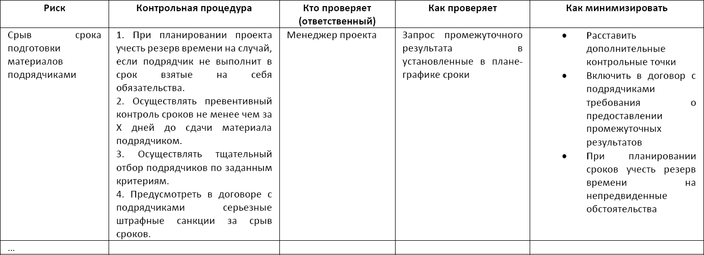 Риски, которые попали в столбец «Вероятно и Значимо», требовали особого контроля, специальных процедур по недопущению или минимизации. Например, выход из строя оборудования (программного обеспечения, принтера и т. д.) вероятен и значим, так как может привести к увеличению сроков изготовления отдельных элементов креативного контента в связи с ремонтом или заменой оборудования. Однако данный риск можно минимизировать, заранее проведя профилактический осмотр и изыскав альтернативные возможности выполнения данного вида работ.