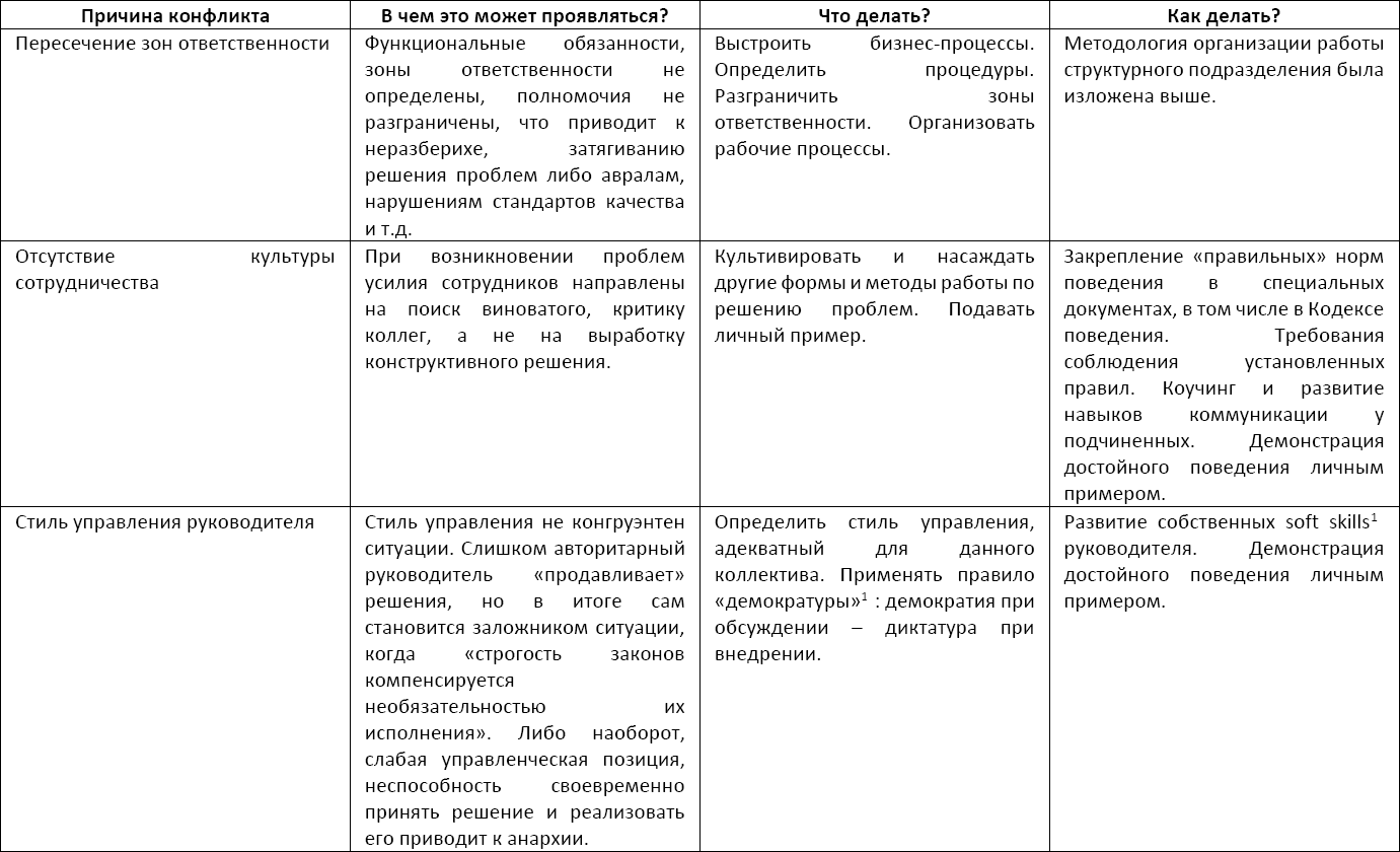 Мы провели диагностику и определили причины конфликтов в нашем структурном подразделении с помощью методологии, представленной в Таблице 13. Для этого мы рассмотрели все перечисленные выше причины разногласий, «примеряя» их на наш отдел, и попытались ответить на вопросы «Что делать?» и «Как делать?» в том или ином случае. В результате получили следующие выводы (Таблица 13).