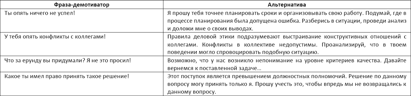 Для тренировки навыка конструктивной критики мы сделали еще одно упражнение. Мы составили перечень наиболее распространенных фраз-демотиваторов и придумали альтернативные выражения, направленные на изменение поведения сотрудника в будущем (Таблица 14). Составленные нами альтернативные фразы позволяли влиять на изменения в поведении сотрудников, не используя при этом обидных, демотивирующих оценочных суждений.