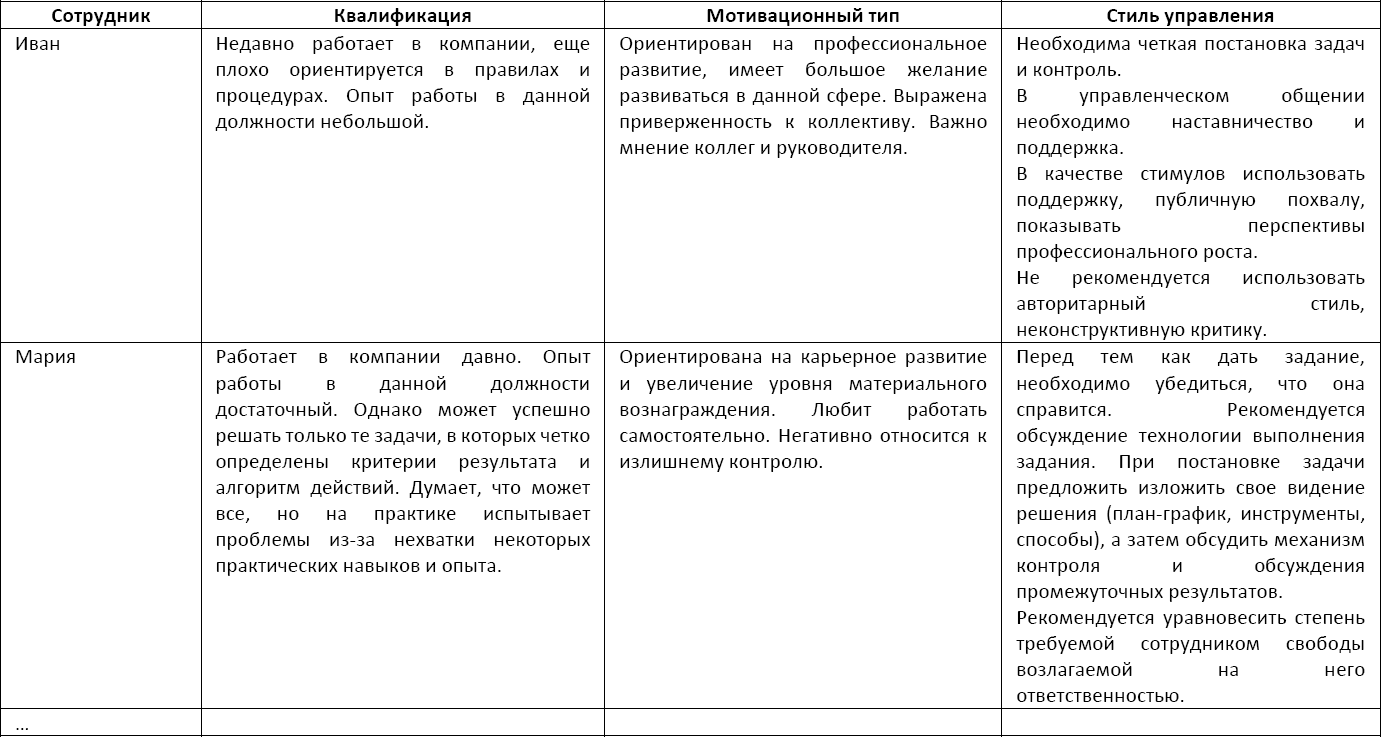 Структурирование информации в такой форме позволило руководителю проанализировать мотивационный потенциал своего отдела, чтобы при необходимости осуществления управленческого воздействия не идти на поводу у эмоций, а спокойно подобрать индивидуальный стиль управления для каждого своего сотрудника.
