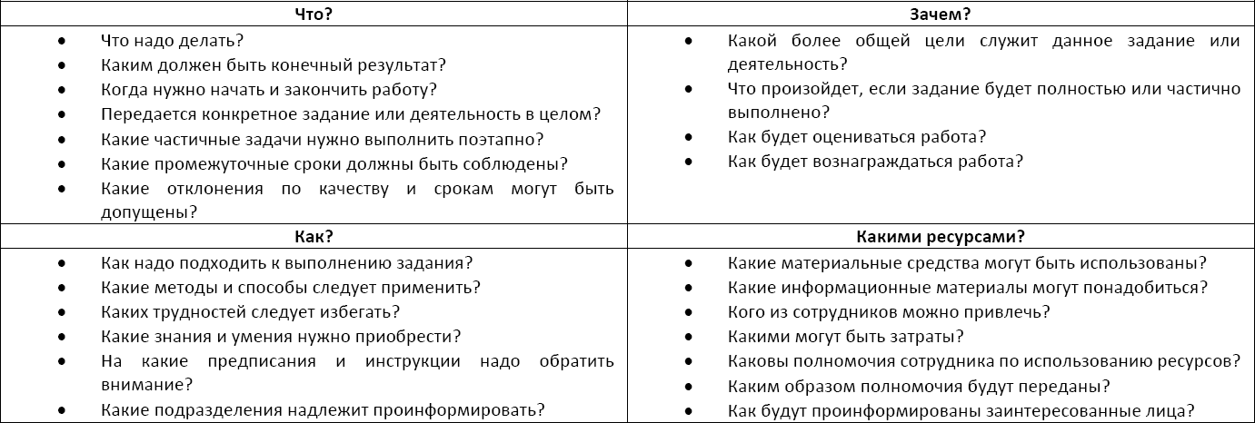 В зависимости от квалификации сотрудников, можно по-разному использовать представленную ниже методику постановки задач подчиненным: с кем-то из сотрудников необходимо проработать данные вопросы совместно, кому-то можно поручить сделать это самостоятельно и потом проверить результат.
