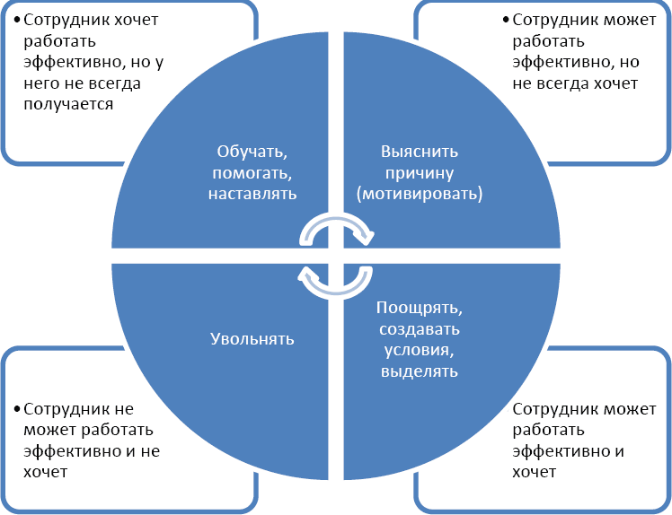 Если какой-то подчиненный обладает достаточной для выполнения своих функций квалификацией, но работает не на высшем уровне своих возможностей, необходимо сначала установить причину. Возможно, что у подчиненного пропала удовлетворенность работой либо есть какие-то личные причины, «отвлекающие» от работы. Причину «выгорания» необходимо выявить. Возможно, что ситуацию удастся исправить за счет индивидуальных способов мотивации сотрудника. Бывает, что «вернуть» сотрудника к эффективной работе невозможно. Тогда стоит задуматься о целесообразности продолжать совместное сотрудничество.