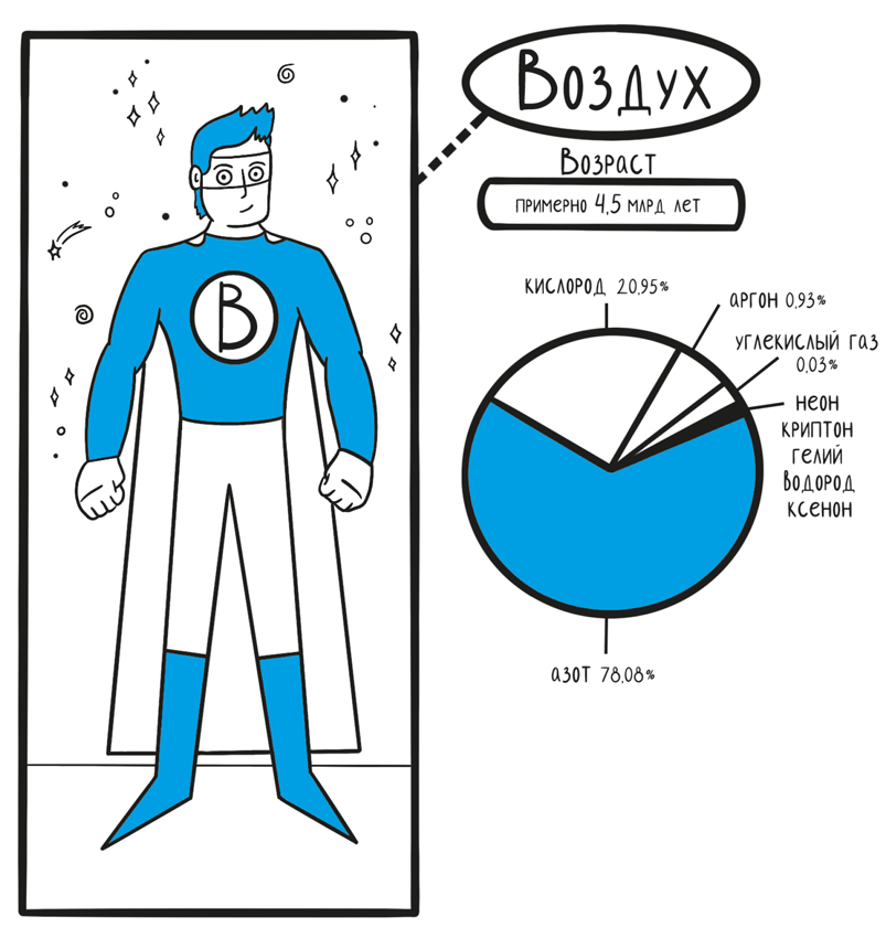 Первая часть «Что такое воздух», собственно, о том, что это такое и откуда он взялся. Его история, строение атмосферы, рассказ о каждом компоненте в отдельности – познавательно, но и не без юмора.