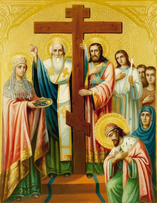 По благословению Иерусалимского патриарха Макария люди принялись копать, и вдруг вокруг разлилось дивное благоухание. В том месте были найдены три креста. Поначалу не могли определить, который из трех – Крест Господень, превратившийся из орудия позорной смерти в знамя христианских побед. Мимо несли для погребения мертвеца. И тогда его стали прикладывать к каждому кресту. И когда приложили ко Кресту Господню – мертвец силою Животворящего Древа восстал живым – воскрес. Все, кто был рядом с царицей и патриархом, поклонились Кресту. Из-за тесноты многие не могли видеть Крест Господень и просили хотя бы издали показать его. Тогда патриарх Макарий, став на возвышенном месте, воздвиг (поднял) святой Крест, показывая людям. Множество людей в тот миг уверовало во Христа. Для хранения святыни был сделан искусной работы серебряный ковчег.