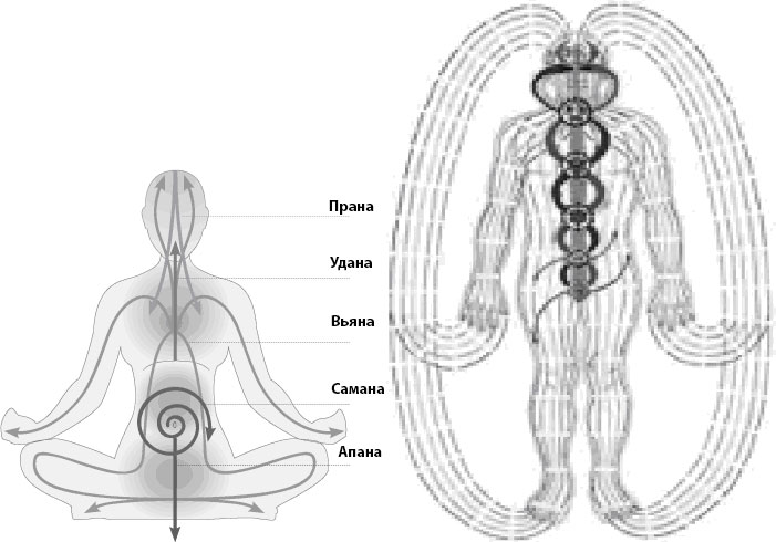 Рис. 7. Схема движения потоков праны в теле и вне его.