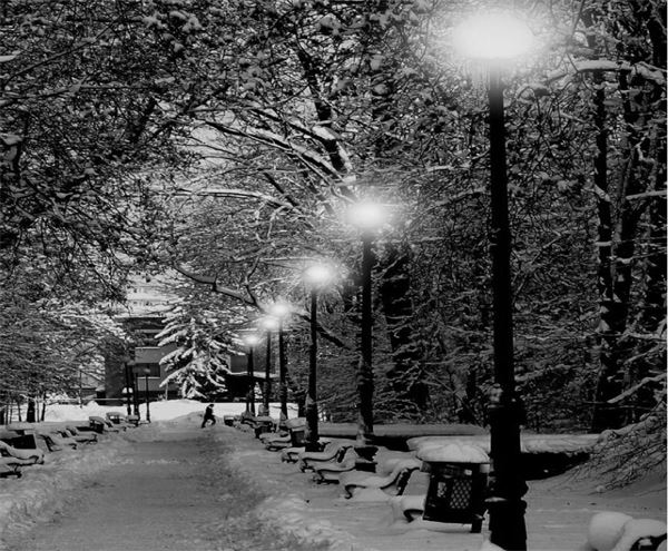 Навстречу ей прошли юноша и девушка, о чём- громко разговаривая. Затем, толкаясь и смеясь, они начали обсыпаться снегом…
