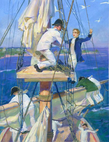 Он взялся за вантовые канаты и начал осторожно карабкаться вверх по зыбким ступенькам. Сперва это совсем не страшно, палуба ещё близко. Но вот он миновал марсовую площадку на мачте и полез дальше. Тут уже дух захватывает, и сердце отчаянно стучит. Хочется назад, на палубу, но Павел упрямо поднимался всё выше и выше – к брамсельным парусам. Корабль внизу казался совсем маленьким, сорвёшься – и полетишь прямо в морскую пучину.