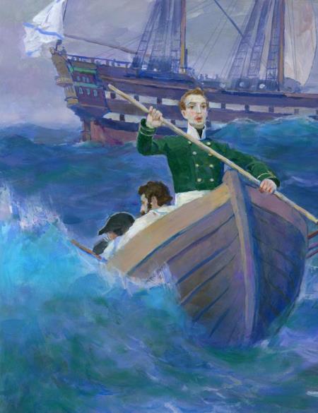 Тотчас же в воду полетели спасательные буйки, за которые упавший мог бы ухватиться. Но фрегат, шедший полным ходом, не сразу остановился и уплыл далеко от несчастного. Шестеро матросов сели в шлюпку. Седьмым в неё запрыгнул мичман Нахимов. В этот час он был свободен от вахтенного дежурства, вместо него в шлюпку должен был сесть другой офицер. Но Павел Степанович не раздумывал, кому спасать человека.