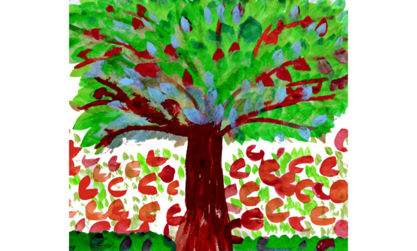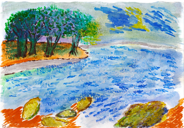Хаят шёл по лесу и удивлялся его красотам. Лес казался ему необычным и волшебным. В Огненной стране дома, земля, деревья были окрашены в красный, жёлтый, охру, оранжевый цвета. Чудесный зелёный лес пестрил другими красками.
