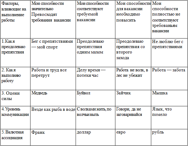 Можно предложить вариант самооценки кандидата в шуточной форме, что поможет снять психологическое напряжение при проведении оценочных процедур. Это также будет способствовать возникновению доверительных отношений и устранению дискомфорта между субъектом и объектом оценивания. К примеру, предложим следующий вариант самооценки, где ответы кандидата отмечаются в свободной форме.
