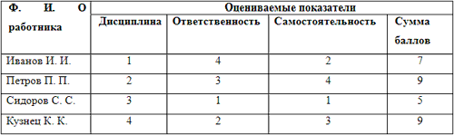Прямое ранжирование кандидата или кандидатов, входящих в оцениваемую группу, проводят по какому-то определенному показателю (например, самостоятельность, инициативность) от самого плохого до самого хорошего. Также ранжирование может проводиться и по нескольким показателям, в таком случае ценность работника будет определяться полученной им суммой баллов. Прямое ранжирование проводится с применением специальной таблицы, которую наглядно можно представить следующим образом.
