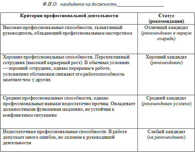 В большинстве торговых организаций оценка деловых и организаторских качеств кандидата на должность (рабочее место) производится с помощью метода экспертных оценок. При этом для характеристики кандидата на должность сначала устанавливают (с учетом специфики направления деятельности и условий работы) критерии его соответствия. Например: