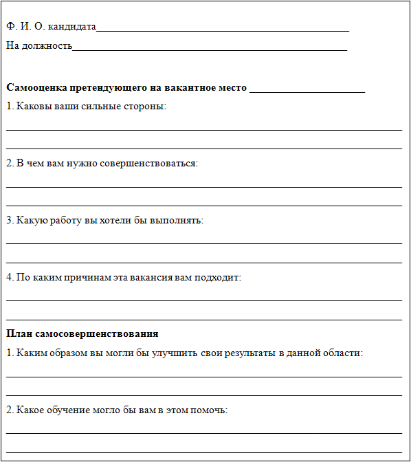 1. Односторонняя оценка, в процессе которой кандидат оценивает соответствие себя конкретной вакансии. Он раскрывает представление о самом себе: положительные и отрицательные черты личности, адаптированность к работе в торговой сфере, приоритетные задачи в жизни и работе. К примеру, односторонняя самооценка, состоящая в заполнении предложенной ниже анкеты, позволяет определить психологические, образовательные и другие пробелы личности оцениваемого.