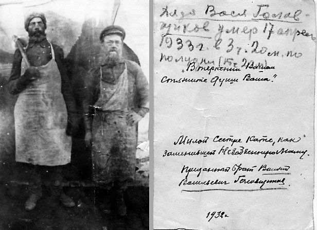 Из обвинения: «… являясь благочинным, всячески использовал свое положение благочинного для оказания помощи ссыльному духовенству, пытаясь эту помощь оформить организационно…»[182]. Месяц понадобился ОГПУ, чтобы «разобраться» в деле, признать Василия Головщикова виновным и заслуживающим наказания – заключения в концлагерь сроком на пять лет. Дальнейшая судьба о. Василия неизвестна. Где он отбывал наказание? Как погиб? Сохранилась переснятая фотокарточка, на которой Василий Васильевич стоит рядом с другим заключенным. На обороте написаны слова из Евангелия, как завет: «В терпении Вашем стяжите души Ваша». И далее: «Милой сестре Кате, как заменившей незабвенную маму. Преданный брат Василий Васильевич Головщиков. 1932 г.». Поверх этого написано другой рукой (возможно, рукой тети Лёли): «Дядя Вася Головщиков умер 17 апреля 1933 г. в 3 ч. 20 мин. пополудни (15 ч. 20 мин.)». Эта надпись сделана уже для нас, потомков. Чтобы помнили.