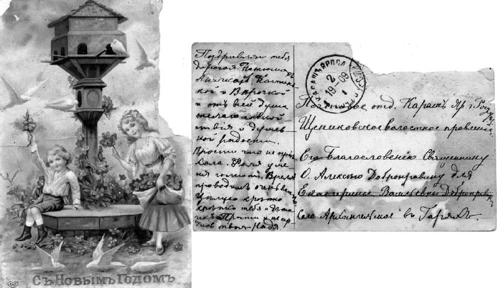 Чудом сохранилась открытка – поздравление с новым годом, написанное Надеждой сестре Екатерине в село Архангельское в Гарях: