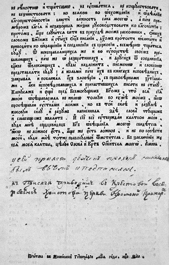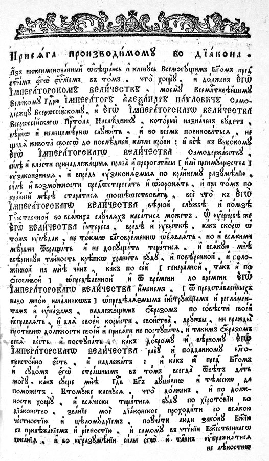 К тому же кленуся … звание мое диаконское проходити со всякою честностию и целомудрием, поучати люди закону Божьему с прилежанием и ревностию, и самому в чтении Божественного писания и во уразумении силы его и таин упражнятися не леностно и тщательно, не упиватися, не кощунствовати, не безчинствовати, но всякою во обхождении и одеянии благопристойность блюсти важность сана моего, а паче примером благия и незазорныя жизни руководствовати ко благочестию … И сие все утверждаю клятвою моею, буди мне сердцевидец Бог обещания моего свидетель, яко не ложное есть, аще же есть ложное и не по совести моей, буди мне тотже правосудный отмститель. В заключении же сея моея клятвы целую Слова и Крест Спасителя моего. Аминь. У сей присяги дьячек Прохор Николаев был в чем и подписался»[28].