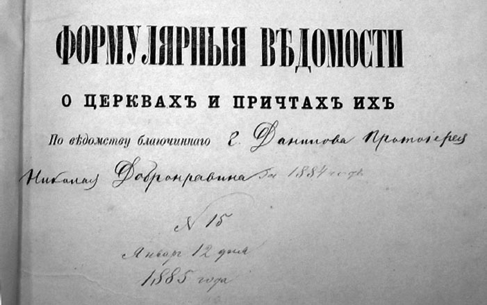 «Формулярные ведомости о церквах и причтах их по ведомству благочинного г. Данилова Протоиерея Николая Добронравина за 1884 год»