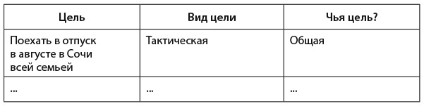 Подумайте: какие тактические цели у вас есть на текущем жизненном этапе? А стратегические? Чьи это цели? Чтобы вам проще было распределить их по группам, предлагаю заполнить следующую таблицу.