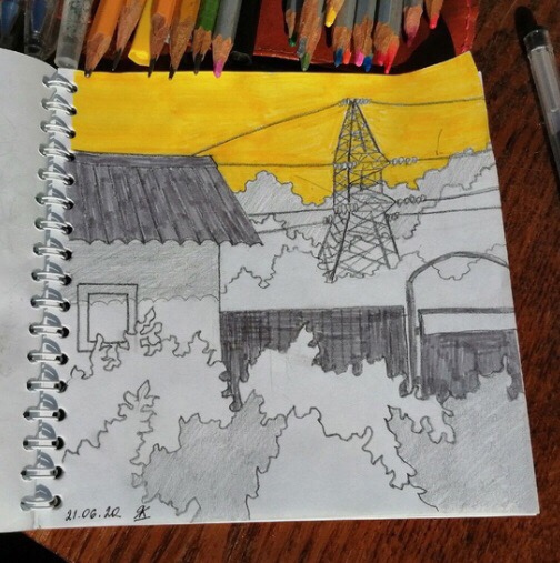 Вид был манящий и гармоничный. Каким и должен был быть. Вышка еле слышно гудела, успокаивая эмоциональную душу. А небо разливалось над всем этим пейзажем широко и приветливо. Разливалось насыщенным кадмием.