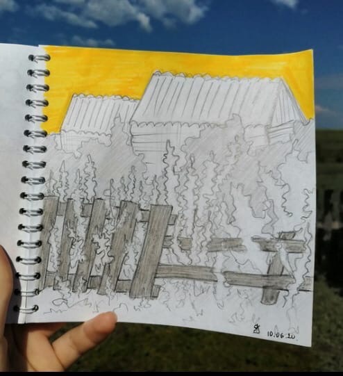 Справа от Маринки виднелась деревушка с дюжиной домиков. Старенькая, простенькая. Будто заблудившаяся в лесу и прибившаяся к вышкам под защиту: мол, укроют, выручат, если что! Глаза художницы тут же оживили ветхие домики, придав им индивидуальный характер и еле уловимый шарм.
