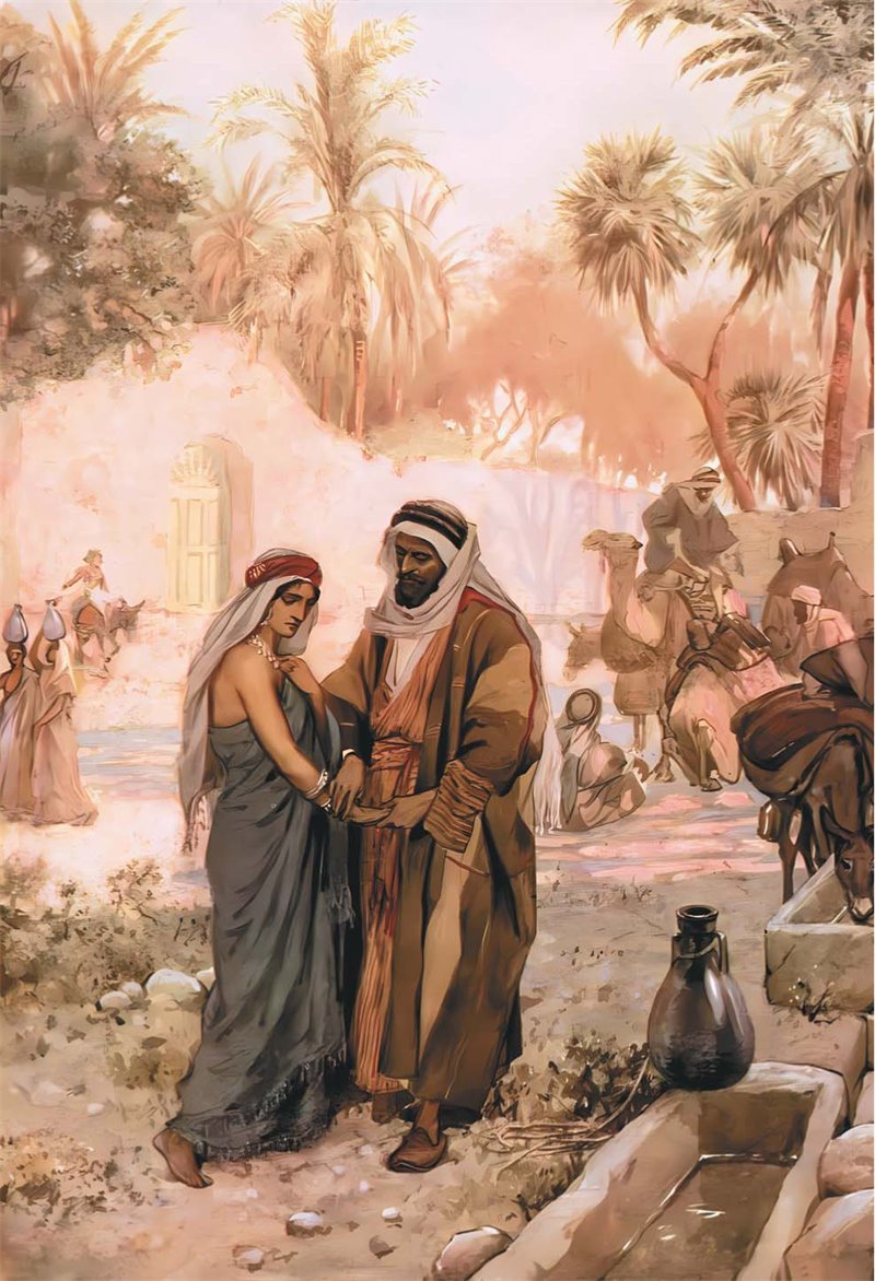 (Быт 23–24)На склоне лет Авраам решил женить своего сына Исаака, но только не на хананеянке, а на девушке своего племени. Он позвал своего раба Элиезера и взял с него клятву, что тот приведет невесту из его родной земли. Раб поклялся господину исполнить его волю, взял с собой щедрые дары и десять верблюдов и отправился в Месопотамию, в город Харран, где жил брат Авраама по имени Нахор.