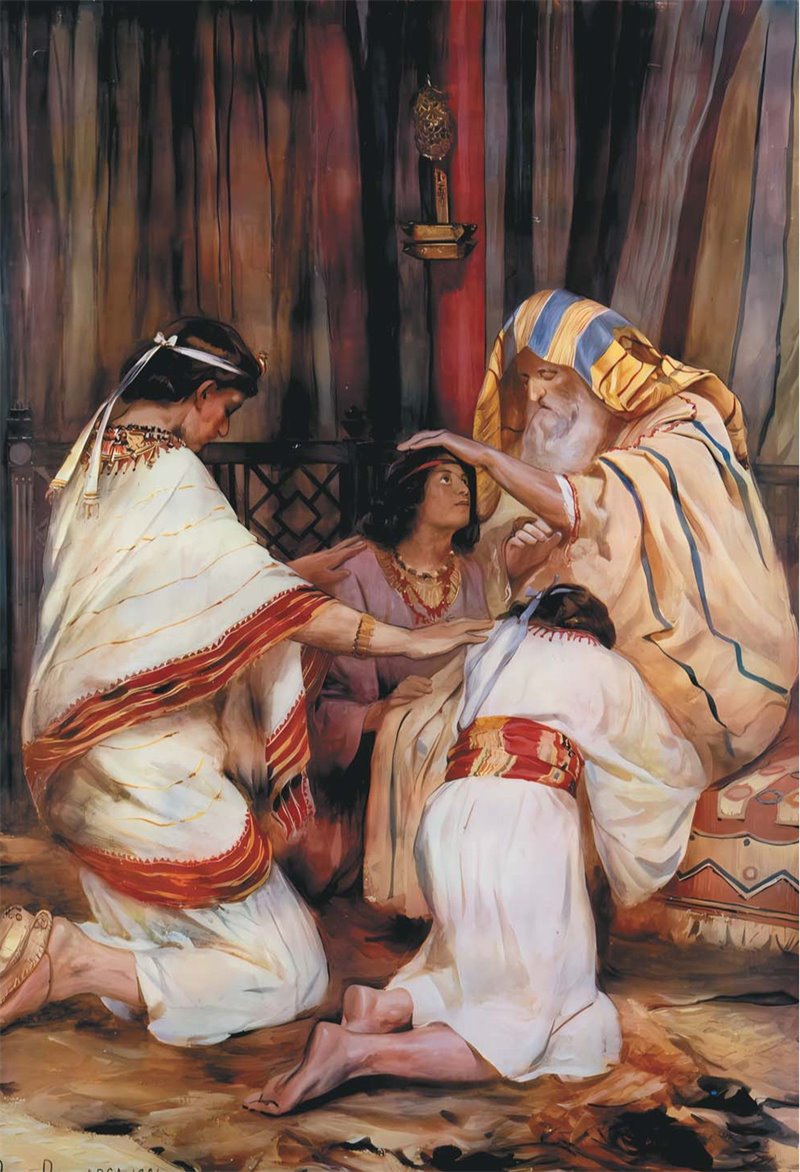 (Быт 48–50)Когда Иаков-Израиль совсем состарил, ослеп и стал чувствовать приближение смерти, то захотел благословить всех своих сыновей и внуков. Иосиф подвел своих сыновей к отцу так, что старший, Манассия, стоял напротив правой руки Иакова, а младший, Ефрем, – напротив левой. Но Иаков сложил руки крестом так, что его правая рука легла на голову Ефрема, а левая – на голову Манассии. И благословил их: Ефрема как старшего, а Манассию как младшего.