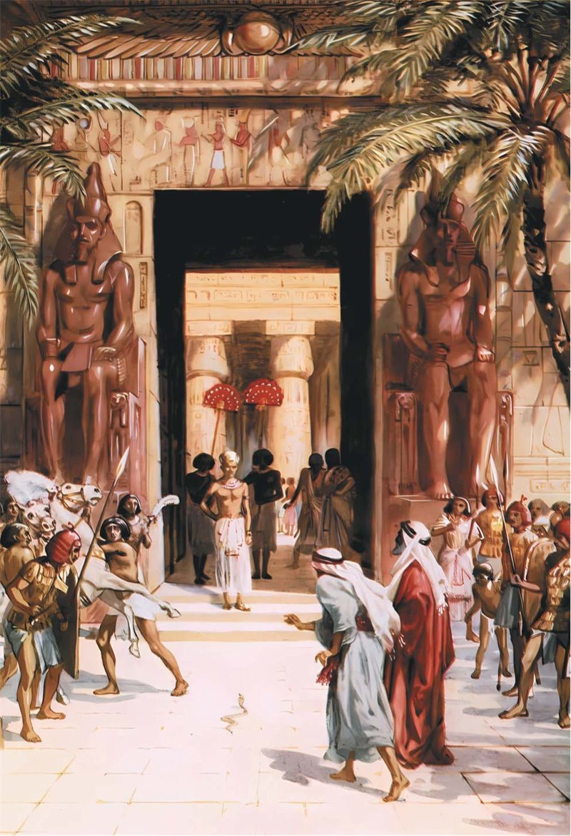 Придя в землю Египетскую, Моисей и Аарон передали волю Господа вначале старейшинам израильского народа, а после и фараону. От имени Бога братья потребовали от фараона, чтобы он отпустил евреев из Египта. Царь египетский ответил: «Я вашего Бога не знаю и народа еврейского не отпущу». Чтобы убедить фараона в правоте своих требований, Аарон по воле Бога бросил свой жезл на землю, и он превратился в змея. Волхвы фараона также бросили свои жезлы, которые обратились в ползущих гадов. Но змей Аарона был самым сильным и поглотил всех остальных.